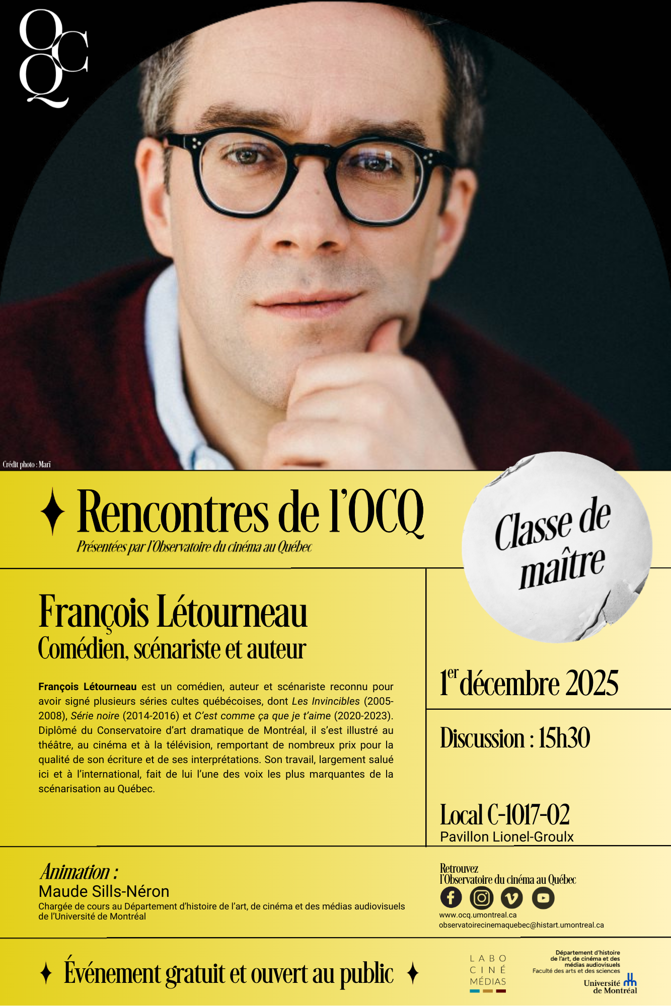 Pour la pro­chaine séance des Ren­contres de l’OCQ, l’Observatoire du ciné­ma au Qué­bec est fier de rece­voir le comé­dien, scé­na­riste et auteur Fran­çois Létour­neau.