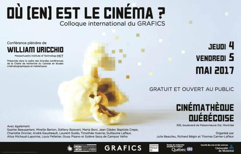 Il se tiendra à la Cinémathèque québécoise les 4 et 5 mai 2017. Ce colloque est organisé par Julie Beaulieu, Richard Bégin membres réguliers du GRAFICS et Thomas Carrier-Lafleur, postdoctorant du GRAFICS. De nombreux étudiants et membres du GRAFICS y prendront part.
