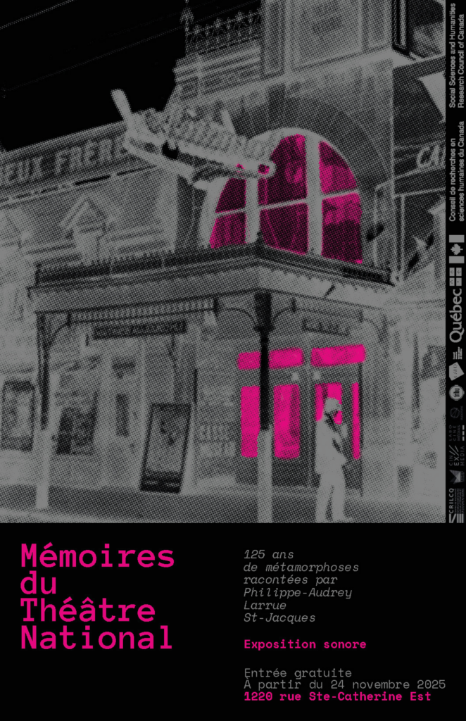 Le lundi 24 novembre prochain dès 17h30 au National (1220 rue Ste-Catherine Est) aura lieu le lancement de l'exposition sonore Mémoires du Théâtre National : 125 ans de métamorphoses racontées par Philippe-Audrey Larrue-St-Jacques.