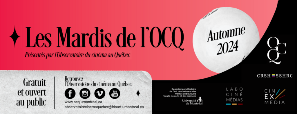 Cet automne, nous aurons le plaisir de recevoir Ghada Sayegh, Éric Falardeau, les productrices de la compagnie de production Art et essai, Anne Émond, Marilú Mallet et Raphaël Rainville. De plus, quatre séances seront co-présentées en partenariat avec le projet « Cadavre exquis : ouvroir de cinéma potentiel ». La monteuse Véronique Barbe sera également reçue dans le cadre du … Continuer la lecture de L’Observatoire du cinéma au Québec (OCQ) est heureux de vous présenter sa programmation pour la session d’automne 2024