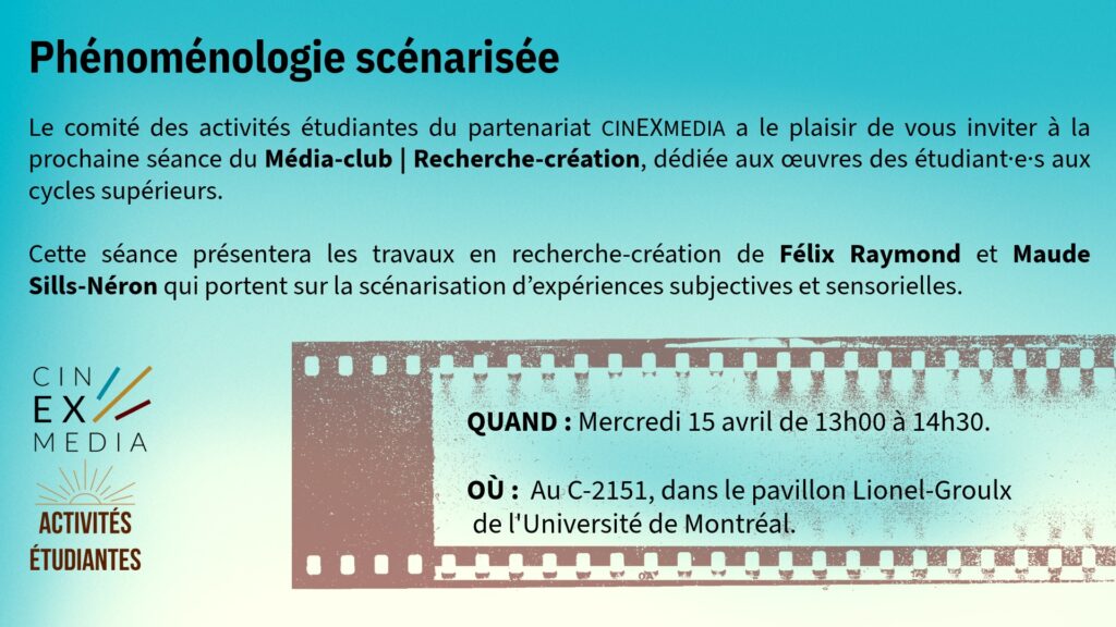 Le comité des activités étudiantes du partenariat cinEXmedia a le plaisir de vous inviter à la prochaine séance du Média-club | Recherche-création, dédiée aux œuvres de recherche-création en cours de création ou réalisées par des étudiant·es aux cycles supérieurs.